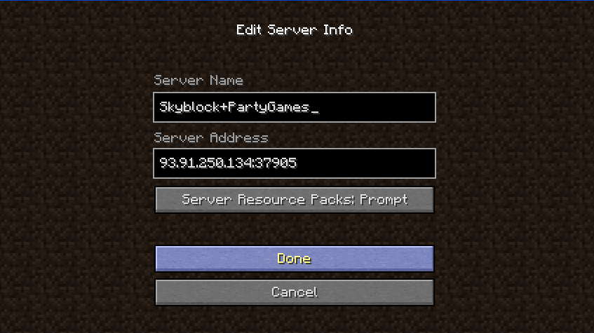 • Jako příklad uvedeme server "SkyBlock+PartyGames", jehož IP adresa je: 93.91.250.134:37905