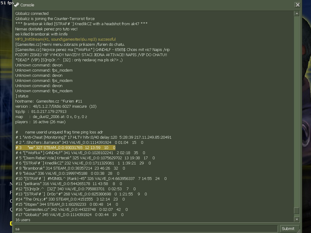 SID: # 3 "ee" 327 STEAM_0:0:93031765 12 13:59 10 0
