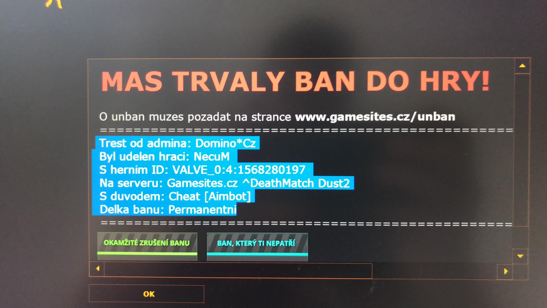 dnes mi byl udelen Ban. Nedostal jsem zadne upozorneni, nikdo mi nic nepsal. Zadne cheaty jsem nepouzival a presto bezduvodne dostal ban od nejakeho admina " Domino cz" - viz screen v priloze. Prosim tedy o unban. Zadny aimbot jsem nepouzival. At Vam prosim tento admin posle dukaz. Dekuji