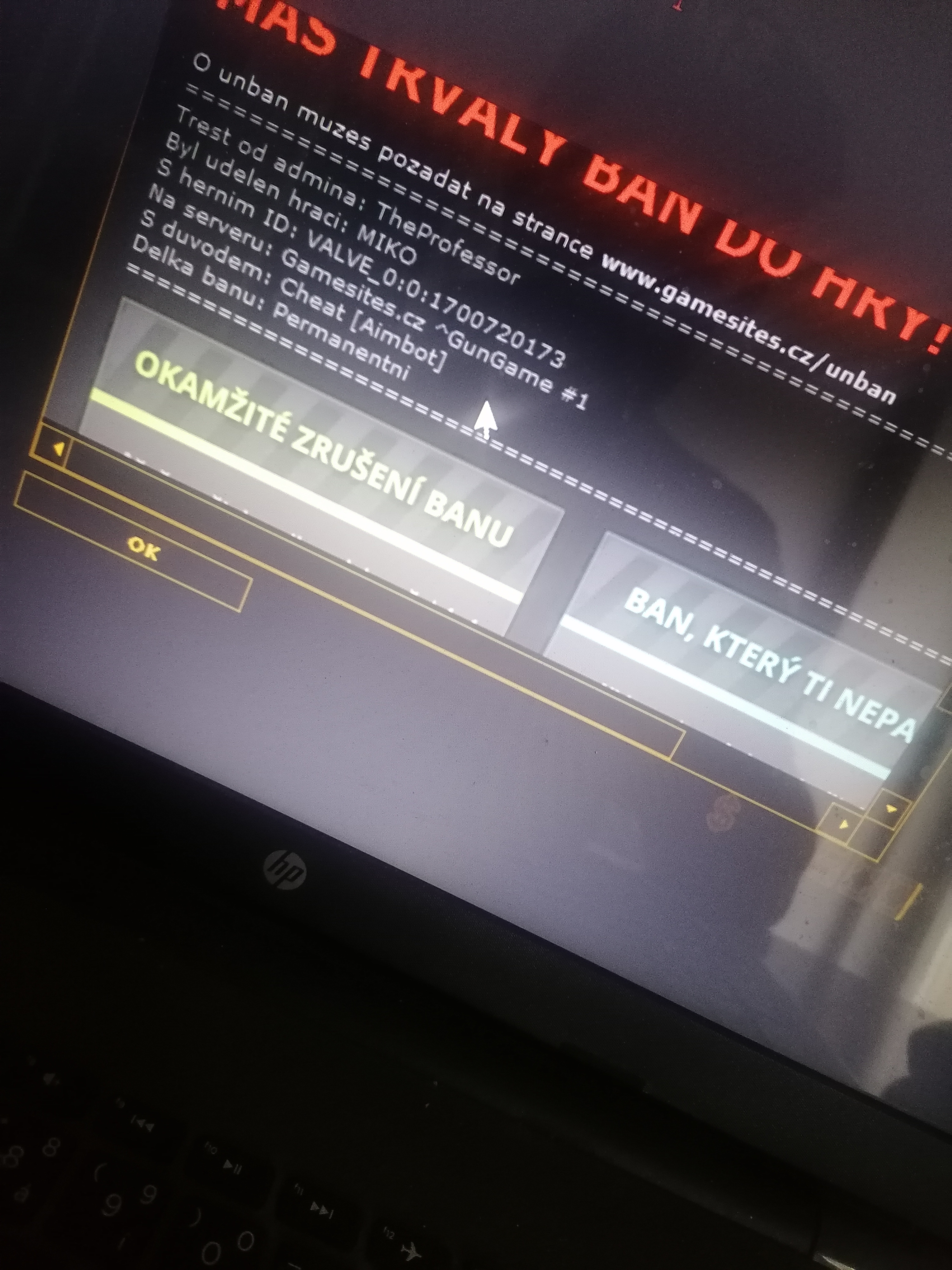 Zdravím, rád by som poprosil o žiadosť o unban lebo včera jak som sa chcel pripojiť napríklad na public 1 tak mi vyskočilo že mám trvalý ban do hry od admina TheProfessor a ešte ma zarazilo to že dal hráčovi MIKO a že ten hráč dostal asi cez moju IP adresu že používal Aimbot .. a ja sa volám *BAN* R4D1K4L práve takže ja viem sám že ja som necheatoval lebo za BAN by mi to nestálo
