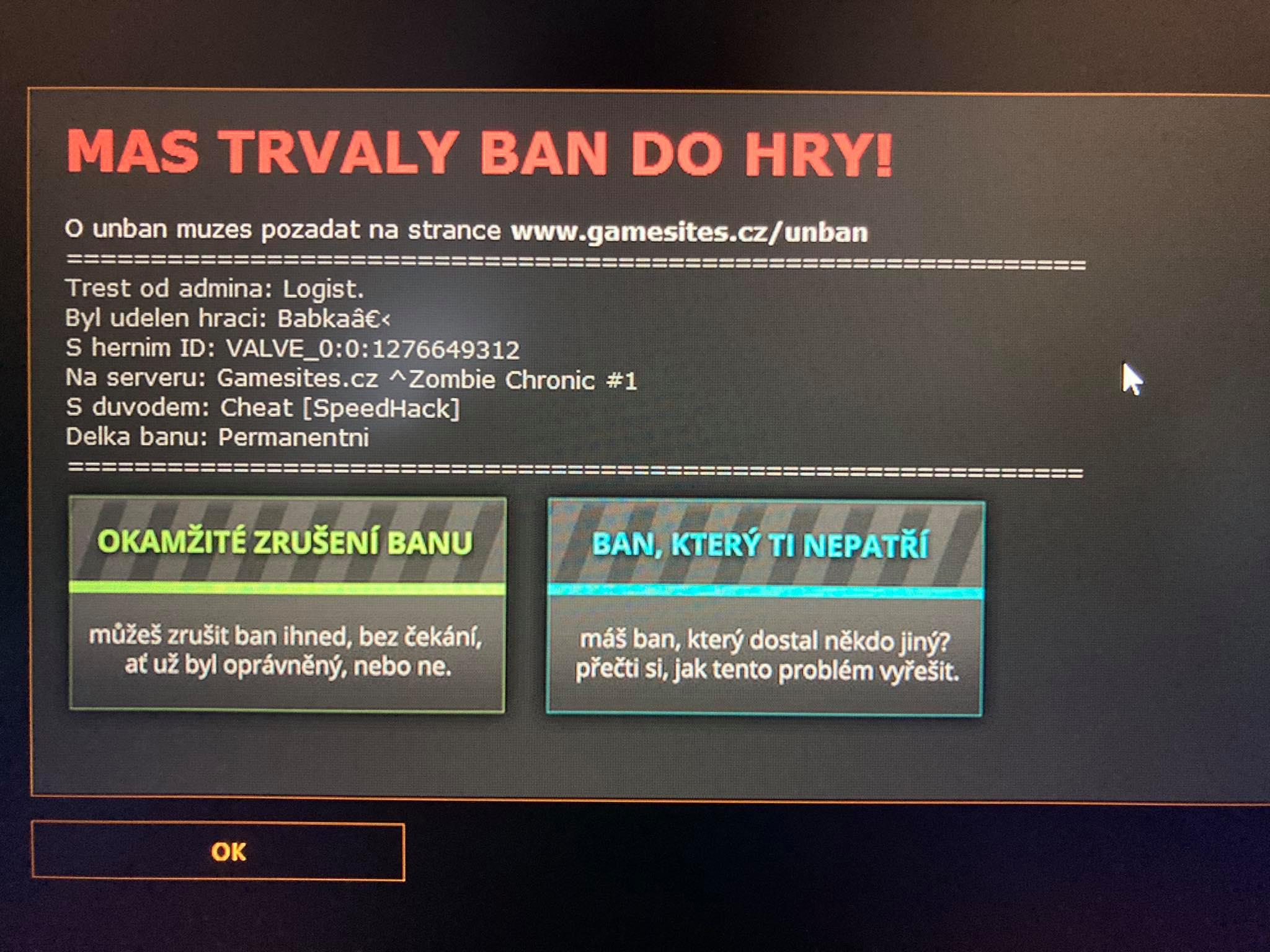 dostal som ban, ktorý nepatrí mne. Môj nick je Patino a server Zombie chronic som asi v živote nehral.
