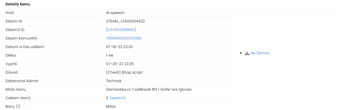 Byl jsem na serveru, zrovna jsem si koupil VIP a tak jsem hrál dostali jsme za úkol bunnyhop a já měl zapnuté scripty a hned potom jsem dostal ban, myslím si že to byl samozřejmě oprávněný ban a chtěl bych se za to podvádění omluvit a říct že už se to víckrát nestane byl jsem blbej a dostal jsem to co jsem si zasloužil, ale vážně bych chtěl zase hrát jb moc mě to baví a chratovat už nebudu.