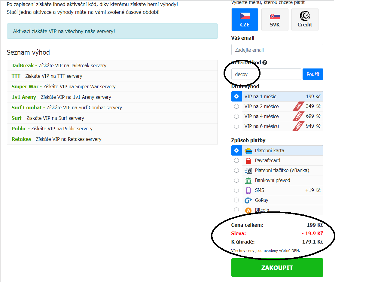 Normálně zajdete na stránky GS (https://aktivace.gamesites.cz/sekce/2-c ... offensive/), zde si vyberete, co chcete koupit. A dojdete zde (https://aktivace.gamesites.cz/sekce/2-c ... 6-vip/CZK/) Zde zadáte email a přihlásíte se zde na steam -> do kolonky "refferal code" napíšete decoy a vaše sleva je uplatněná. + Když zadáte svůj první refferal code získáte ke slevě i bedničku na win.gamesites.cz!
