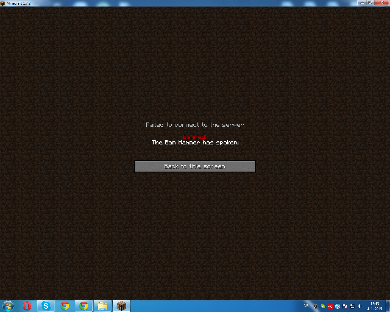 Zakaždým keď sa chcem pripojiť na server survival pod nickom Gandy píše to The Ban Hammer has been spoken . Dostal som ban ale Unban my mali dať už pred 3 dňamy. Na iné servery od GS mi ide sa pripojiť aj pod nickom Gandy.Pôvodne som dostal ban za Pascu na hráčov začo sa udeľuje 1 dňovy ban tak mi pripadá nefér že už 3 dni tam nemôžem hrať.