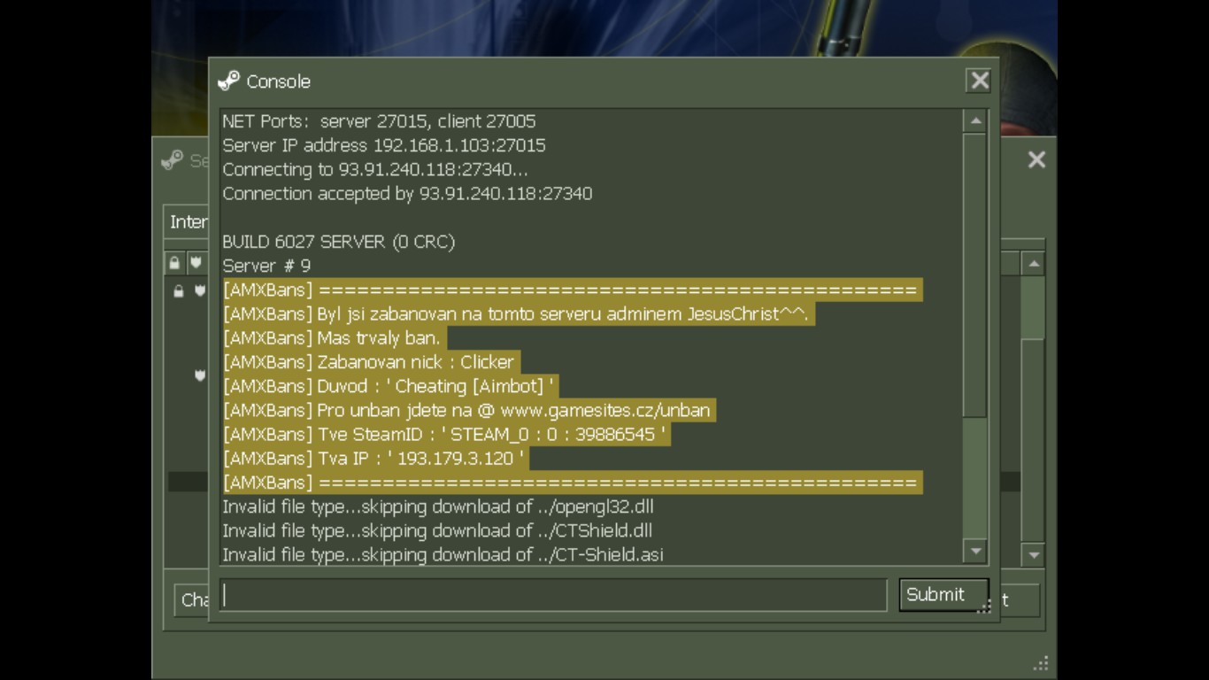 3. Napiš co se stalo: Dobrý den, dnes kolem 1 hodiny odpoledne cca jsem se připojil na server Gamesites.cz|Public Mini hraju tu už docela dlouho ... no k věci ... ééh normálně jsem hrál měl jsem skore asi 20:2 pak mi začal psát hráč nepz ať to vypnu ... říkal jsem si a co mám asi vypnout ab ani wh nemám a nemám za potřebí si tuhle noob věc zapínat a ani stahovat ... asi po 20-30 minutách jsem dostal BAN od hráče JesusChrist že mám ban za cheating (aimbot) rád bych požadoval demo kde je skutečně vidět že jsem cheatoval ... v PC žádné aimboty ani wallhacky nemám jestli chcete screenshot z mého PC tak klidně dodám ale naposled říkám že WH ani AB nemám a ani nemám zapotřebí tyto hacky používat
