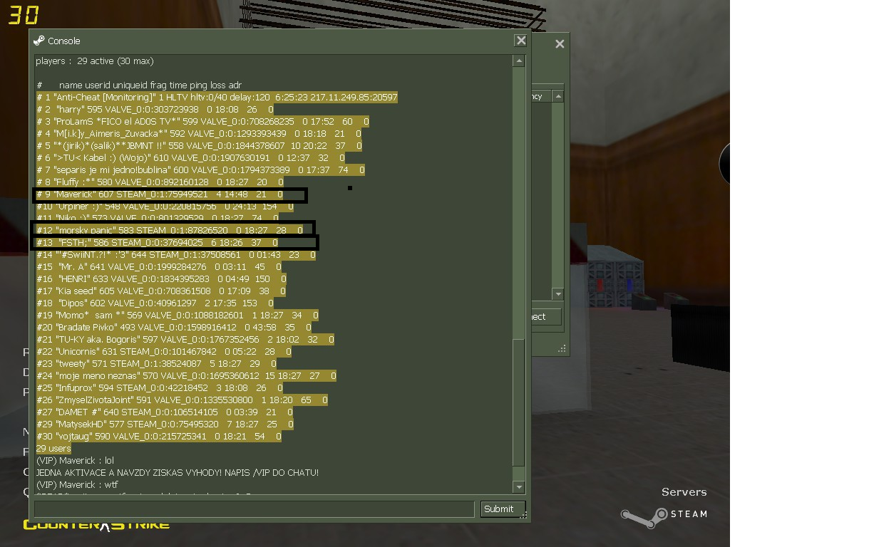 Přijdu na server : a Maverick (T), FSTH; (CT) a Morsky panic (CT) stoji ve zbrojce a povidaji si, všichni 3 v ruce zbraně a hrajou si/kazí simonovi hru. CT Mavericka nezabili protože se domlvili