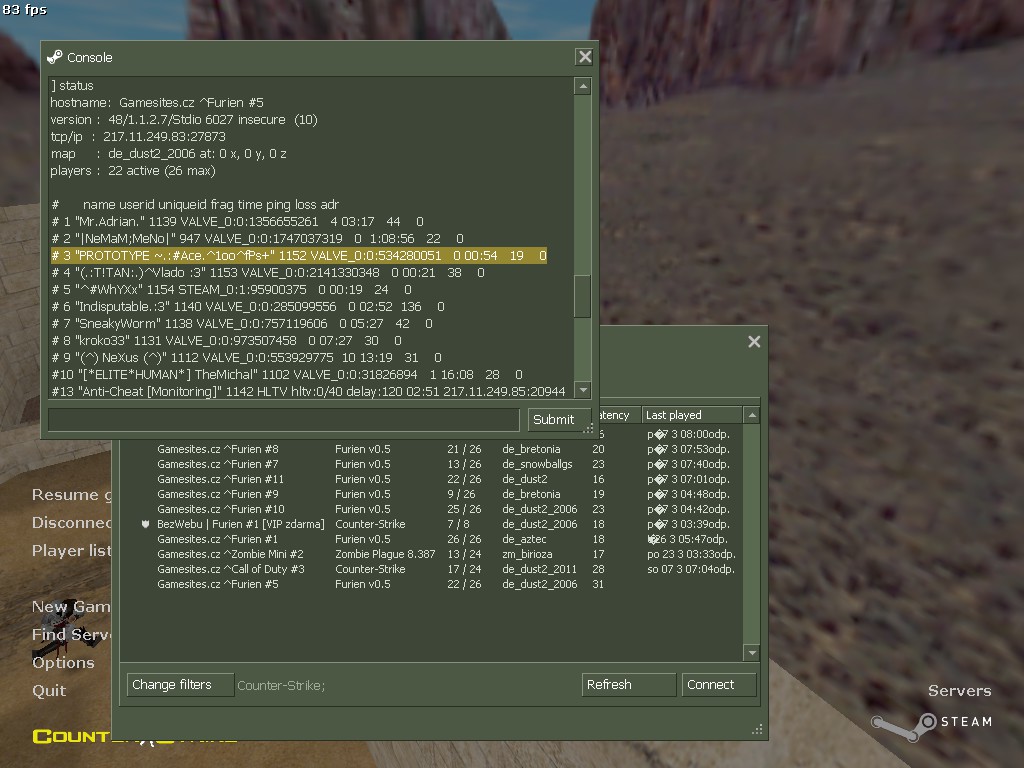 SID: "PROTOTYPE ~.:#Ace.^1oo^fPs+" 1152 VALVE_0:0:534280051 0 00:54 19 0