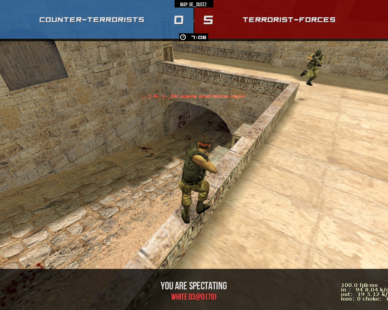 Úspěšně ukradená vlajka a ty stojíš u pozice nepřátelské vlajky a odstřeluješ CT spawn, takto to bylo po celou dobu nesení. Ban jsi dostal, jelikož jsi se provinil chvíli předtím kempem u vlajky s rychlopalkou, za což jsi dostal slap/slay.