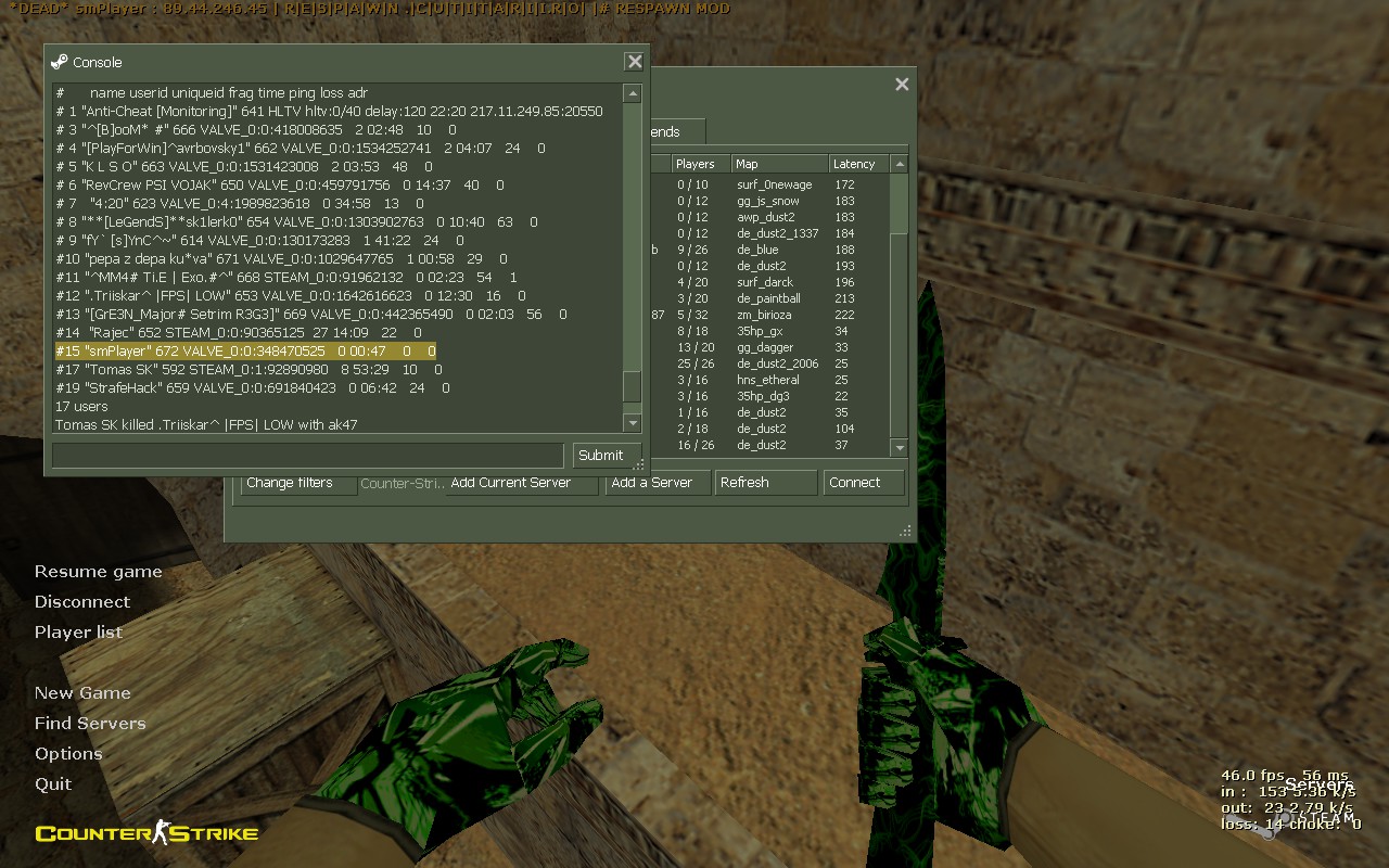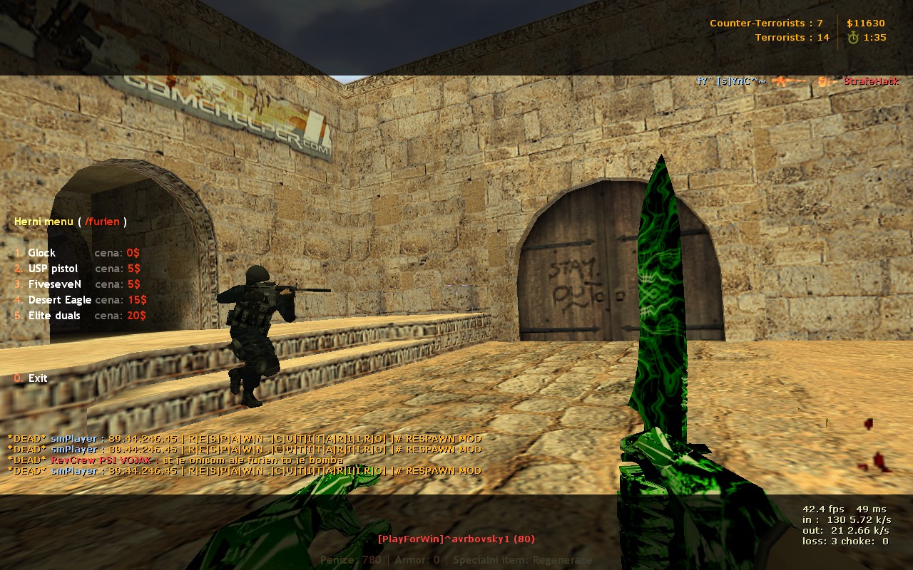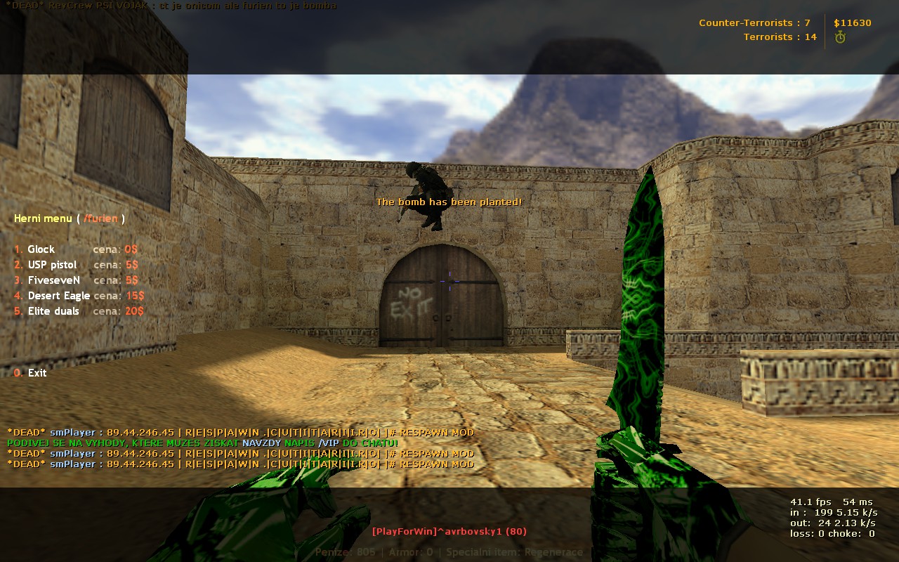 Váš pohled na situaci: Hráč "SPAMUJE" textom "89.44.246.45 | R|E|S|P|A|W|N .|C|U|T|I|T|A|R|I|I.R|O| |# RESPAWN MOD"