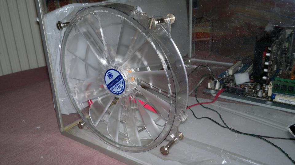 Teď se chystám vyřezat otvory pro dva monstrozní ventilátory. Jeden má v průměru 25 cm a druhý jen 23cm. Ten vědší pujde dopředu před sloty s HDD a Mechanikou a druhý pujde nahoru nad základní desku. Oba dva jsou modře podvětlené, ještě musím zajet do GM-elektronics a koupit 16 RGB LED diod na osvětlení bočnice s tím glavírováním